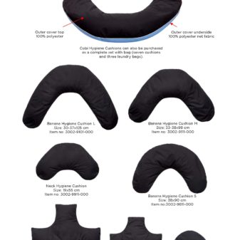 Cobi Hygiene Cushions for bathing and hygiene situations can be used by many patient groups, e.g., generally debilitated users, users with severe malposition or users in need of extra support and stability in bathing situations. The hygiene cushions also benefit the working environment of the nursing staff because the stable positioning of the user reduces the risk of the user slipping or ending up in an inappropriate position.